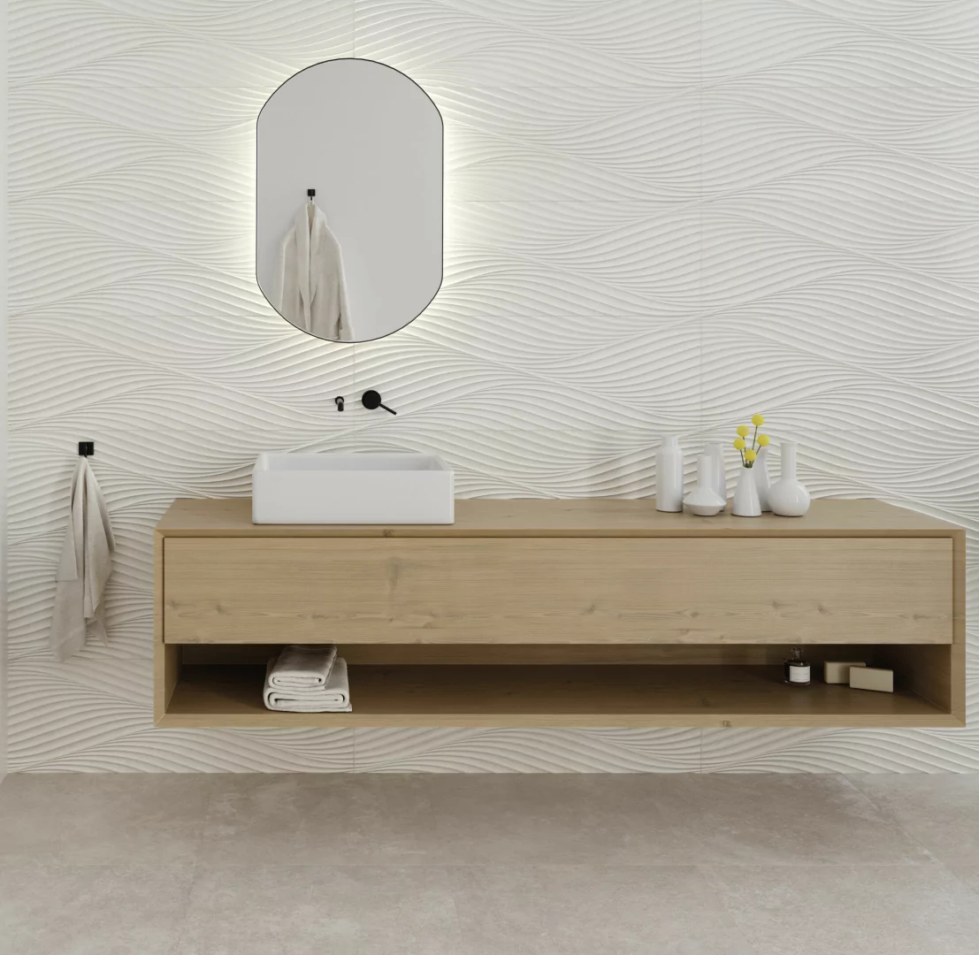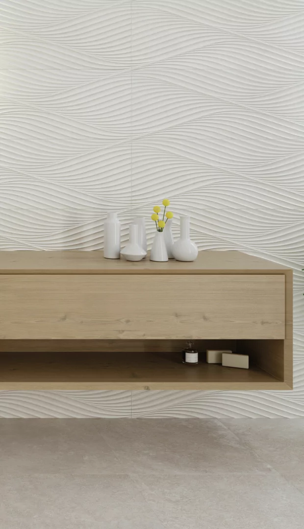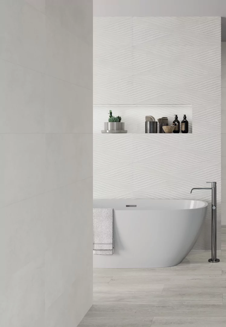 De aspecto cemento, Yakarta es una colección que combina colores neutros: white, silver y sand; perfectamente combinables entre sí, y a su vez, permite la combinabilidad de sus bases neutras con las piezas decorativas de la colección, de relieves suaves, que aportan movimiento y profundidad al espacio.