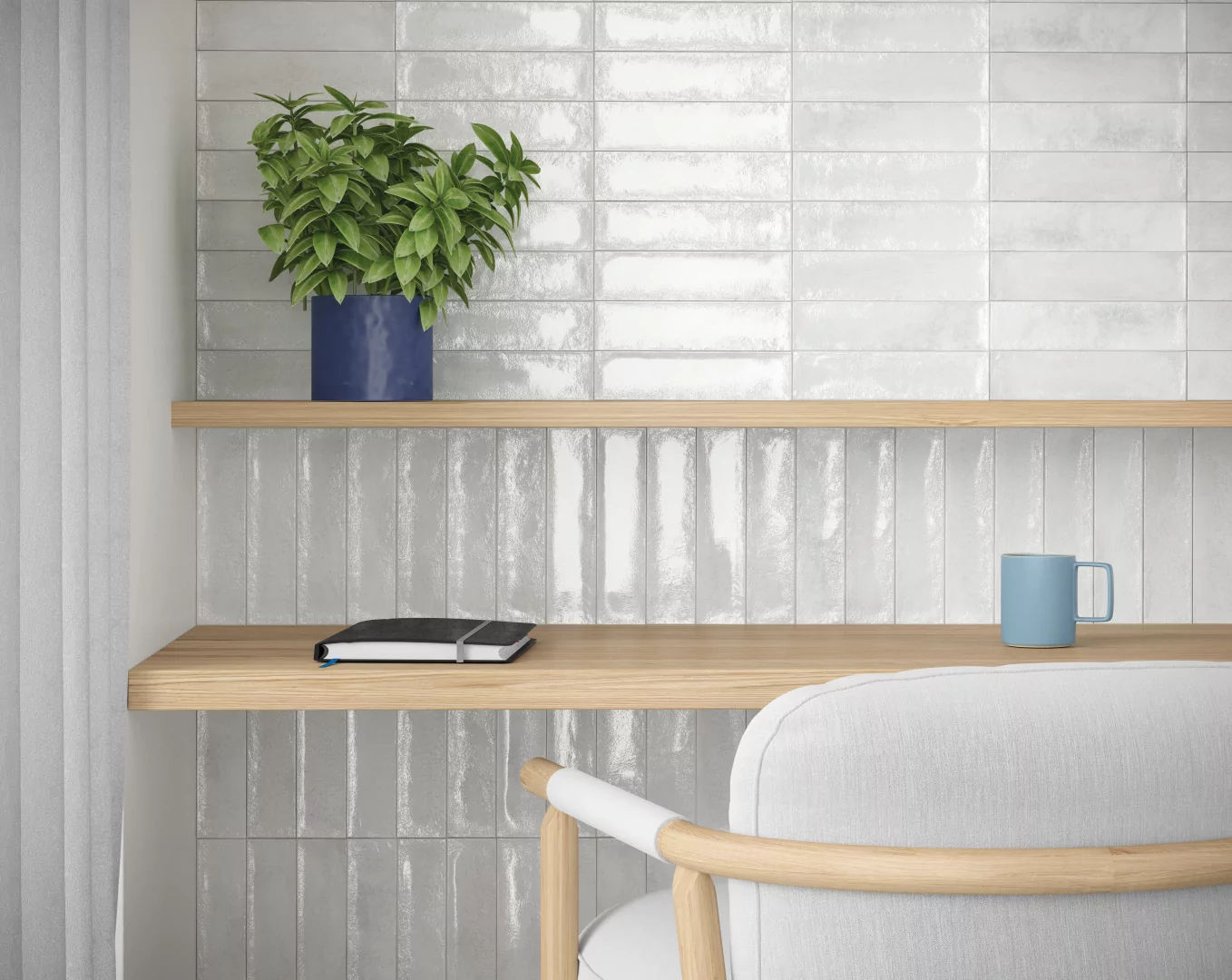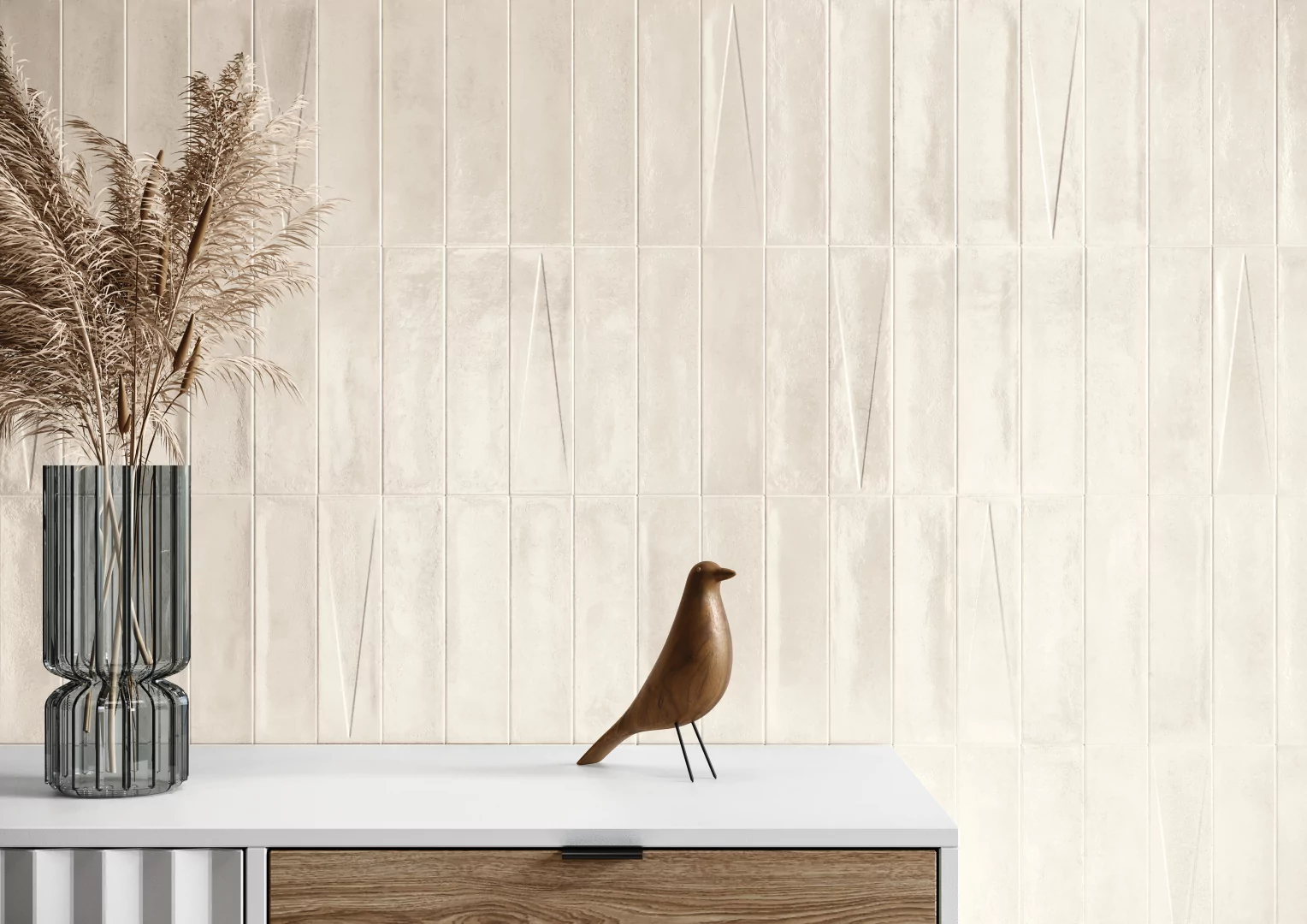 La colección Dart, trabajada en acabado brillo y con una destonificación ligera, juega con dos piezas: una pieza más decorativa, trabajada con una concavidad en forma de flecha que le aporta dinamismo a la estancia; y por otro lado, la base de la misma colección. Tonalidades muy mediterráneas que darán frescura al lugar.